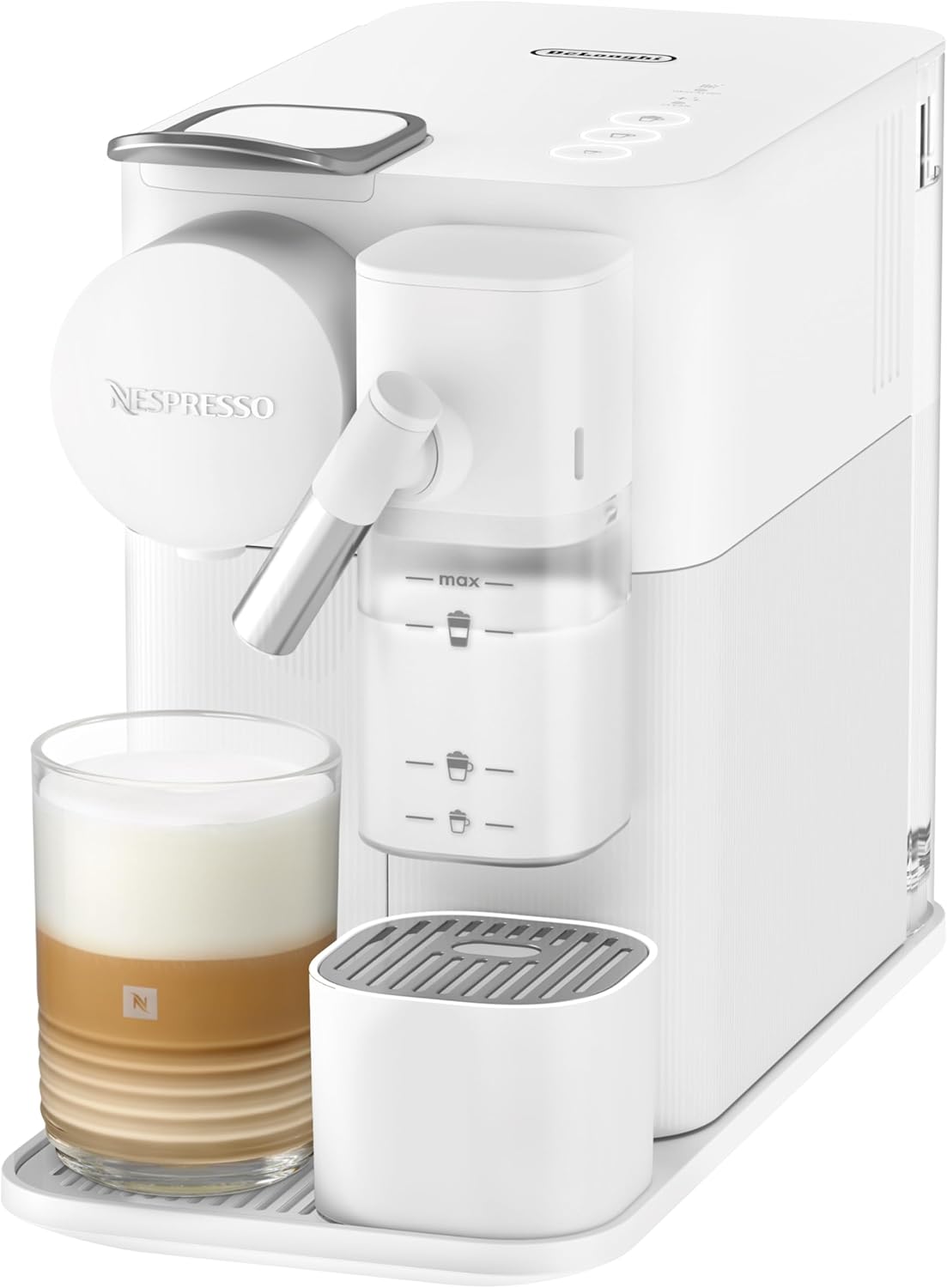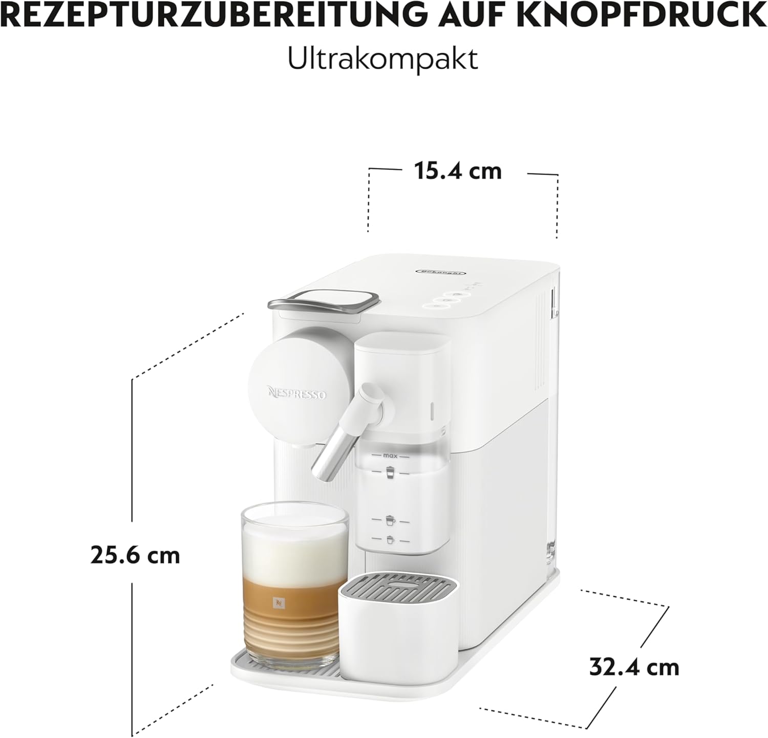 Der integrierte optische Sensor erkennt die eingefüllte Milchmenge automatisch und verwendet diese vollständig. Die verschiebbare Abtropfschale passt sich verschiedenen Tassenhöhen an. Die Maschine zeigt den Entkalkungsbedarf automatisch an.
