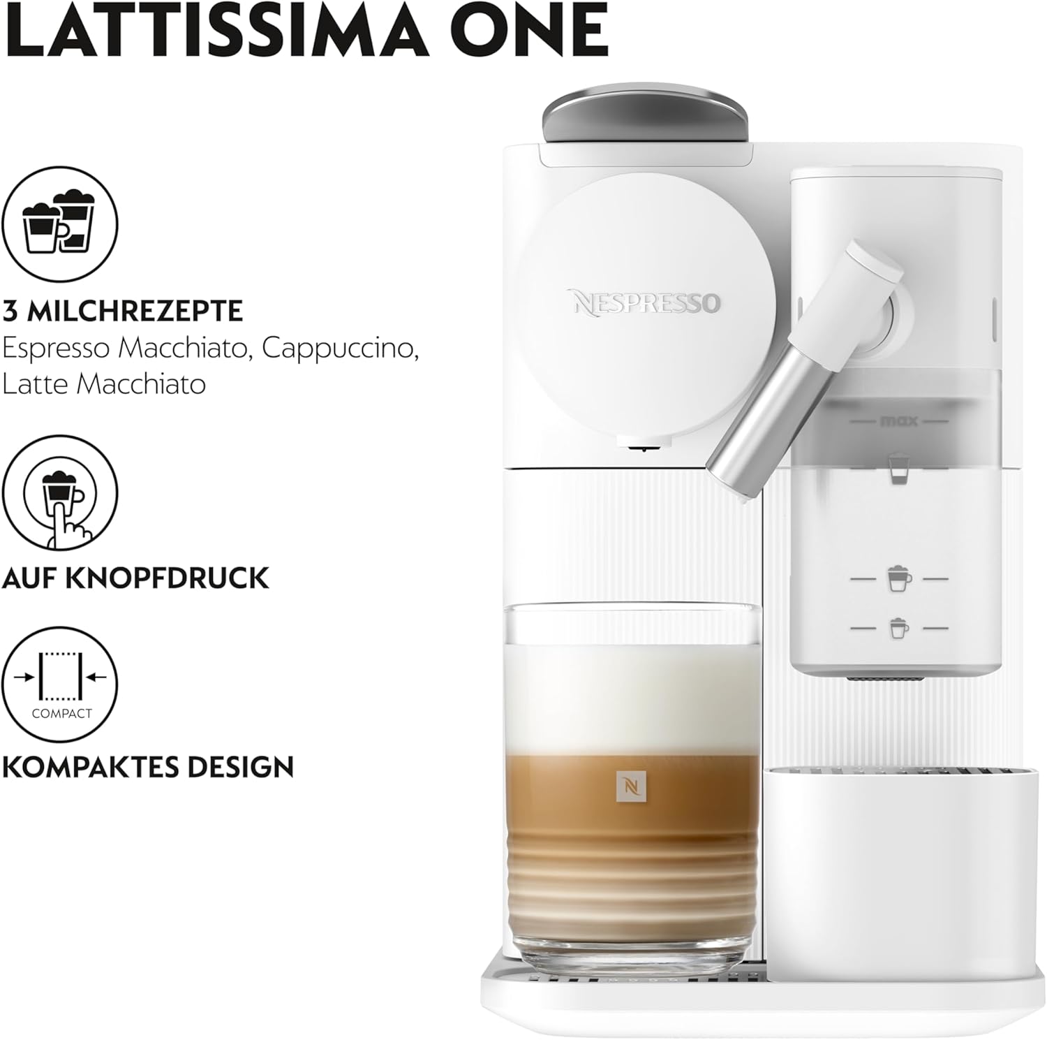 Diese Kapselmaschine ermöglicht die Zubereitung von fünf verschiedenen Kaffeespezialitäten per Knopfdruck. Das integrierte One-Touch-Milchsystem bereitet sowohl klassische Kaffeevarianten als auch cremige Milchgetränke zu.